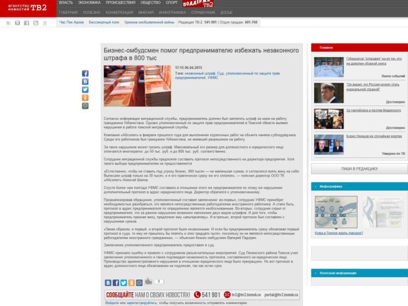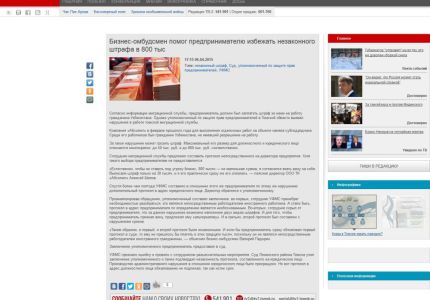 Агентство новостей ТВ2: Бизнес-омбудсмен помог предпринимателю избежать незаконного штрафа в 800 тыс.