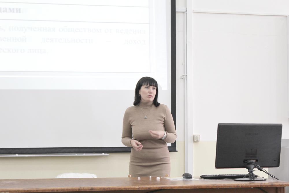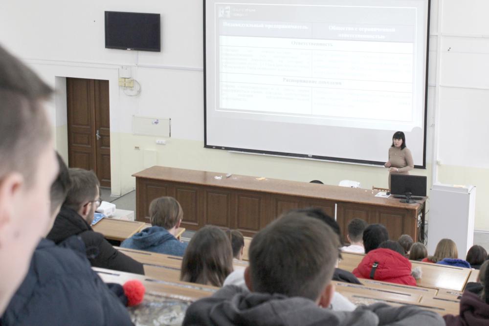 Перед слушателями выступила Анна Санникова — общественный представитель томского бизнес-омбудсмена по вопросам бухгалтерского учета и налогообложения, эксперт Городского центра поддержки предпринимательства. На вопрос спикера «Кто из вас хочет стать предпринимателем?» руки подняли несколько десятков студентов.