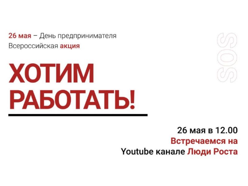 26 мая, в 12.00 по московскому времени, в День российского предпринимательства аппарат Уполномоченного при Президенте России по защите прав предпринимателей Бориса Титова организует всероссийскую акцию «Хотим работать!», которая пройдет на YouTube. Приглашаем бизнес Томской области присоединиться.